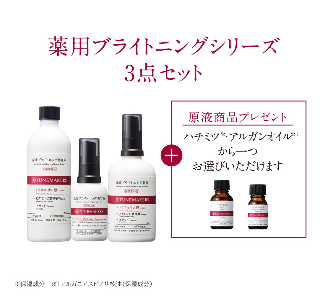 イベント期間中、こちらの「薬用原液ブライトニングシリーズ3点セット」をご購入いただいた方に、チューンメーカーズの原液商品「ハチミツ※」、「アルガンオイル※1」からお好きな原液を1本プレゼントいたします。