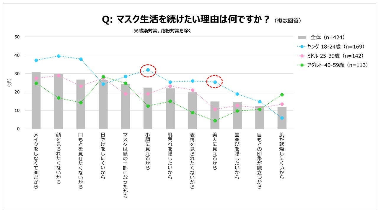 さらに、年代による意識の差が大きく、特にヤング層は隠したい意識がある一方で、「小顔に見えるから(32.0%)」「美人に見えるから(25.4%)」といった回答も目立ち、マスクをつけることで顔立ちの変化やメリットをより感じていることがわかります。