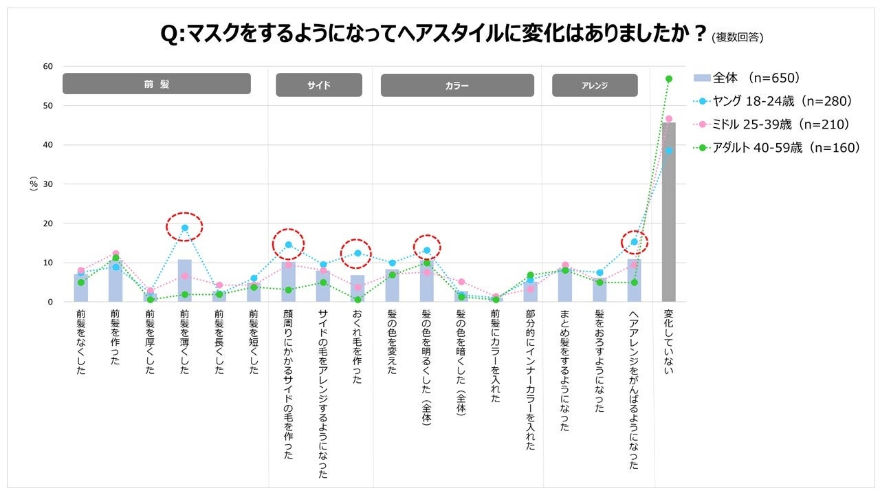 併せて、マスク生活によるヘアスタイルの変化についても尋ねたところ、若いほどヘアスタイルを変えている傾向にありました。特にヤング層は6割以上。前髪を薄くしたり、全体の髪の色を明るくしたり、顔周りにかかるサイドの毛を作ったりと、マスク着用時のバランスをとるためにメイクもヘアを工夫している様子が見られました。
