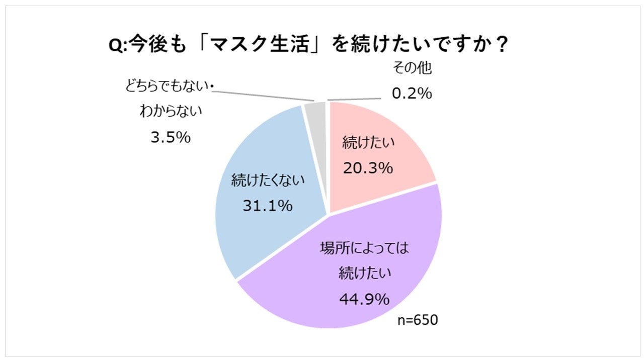 女性650人に、今後もマスク生活を続けたいかを尋ねたところ、最も多かったのは「場所によっては続けたい」で44.9%でした。次いで「続けたくない(31.1%)」、「続けたい(20.3%)」となりました。