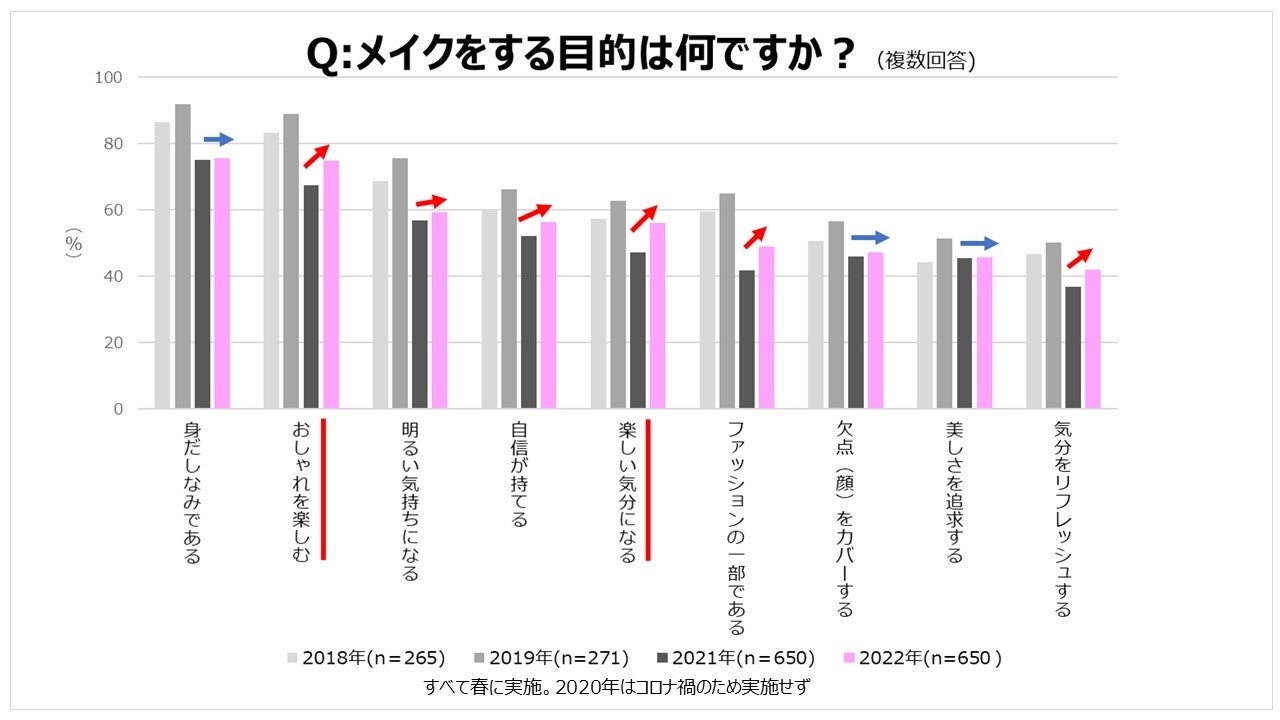 ・メイクをする目的は、「身だしなみである(75.5%)」がトップであるものの、「おしゃれを楽しむ(74.9%)」「楽しい気分になる(56.2%)」など、ポジティブな回答が上位に。過去の調査の回答と比較すると、メイクに対してポジティブな意識が回復傾向にある。