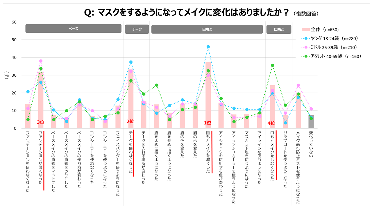 変化の内容としては、「目もとメイクを濃くした(37.5%)」が最も多く、「チークを使わなくなった(33.2%)」、「ファンデーションが薄くなった(31.8%)」、「口もとメイクをしなくなった(24.3%)」と続きました。長引くマスク生活で、マスクをつけていても見える部分のメイクに注力するようになり、顔の中でのメイクバランスが大きく変化したことがわかります。