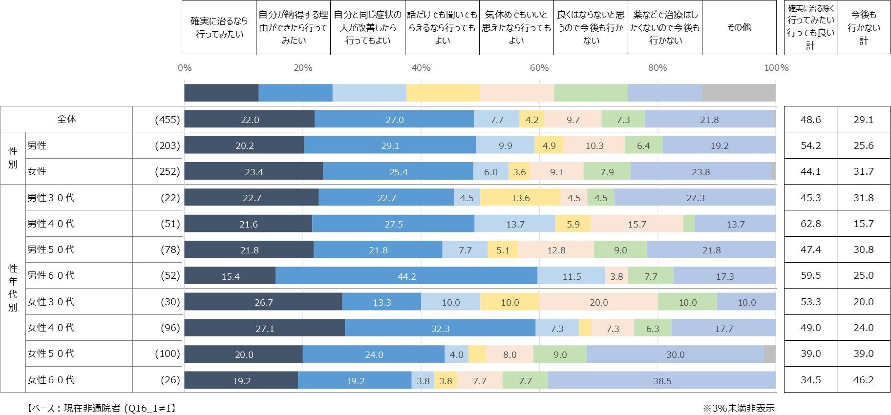 更年期での今後の通院意向は、「確実に治るなら行く」、「今後も行かない」250という層を除くと、半数は「行ってもよい」と回答。特に、男女ともに40代では、約3割が「自分が納得する理由があれば行ってみたい」と答えており、これは今後の課題へのヒントになるのでないかと思われる。