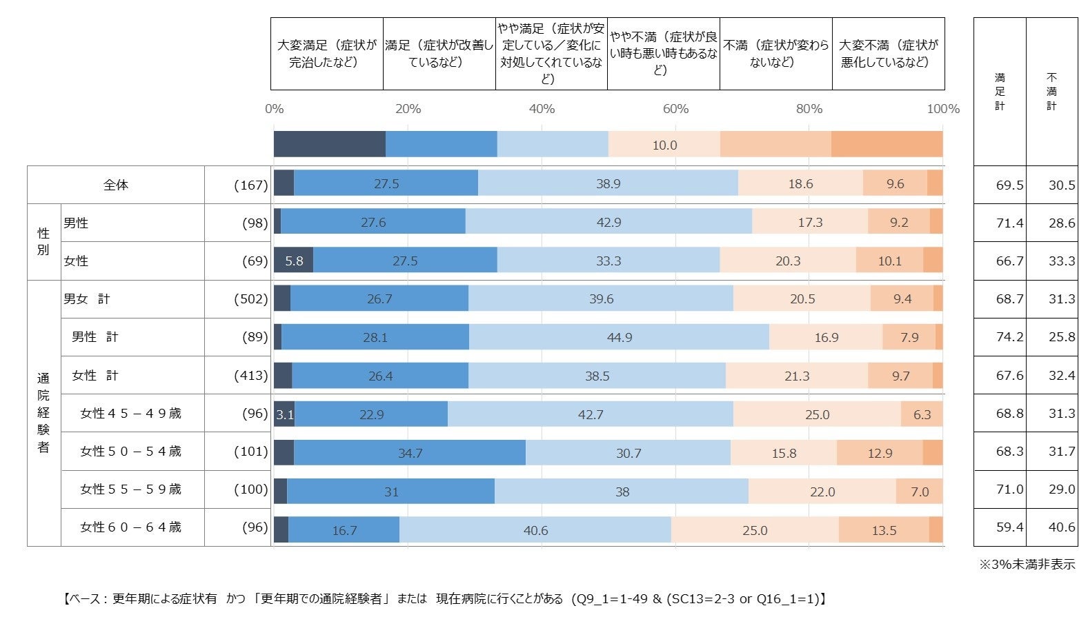 通院経験者における、更年期での通院に対する満足度は約7割が満足している。