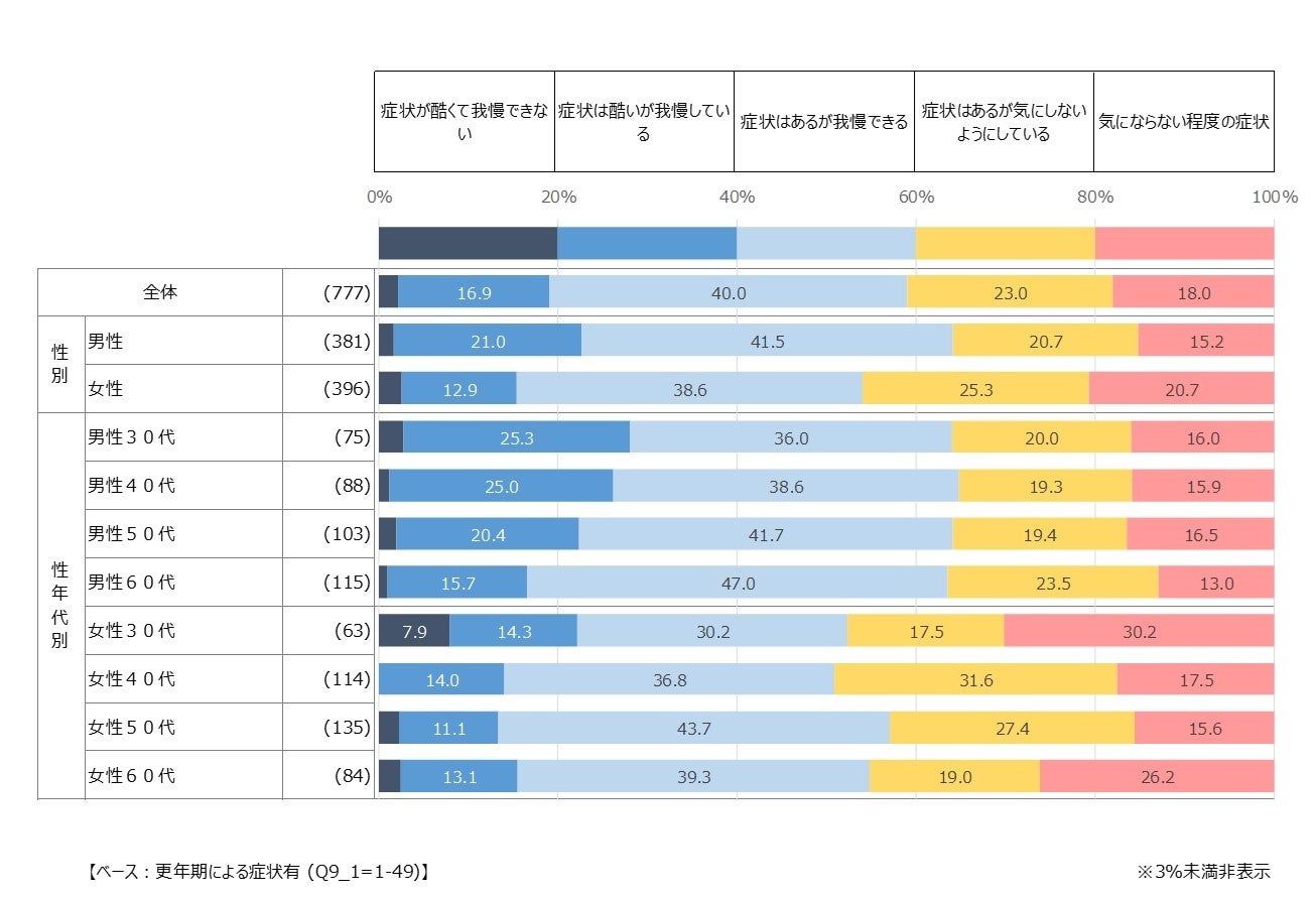 更年期症状の悩み度合いについて、男性は30代~40代で4人に1人が、50代で、5人に1人が「ひどい症状を我慢している」と回答し、女性は40~50代の4割が「症状はあるが我慢できる」と回答。