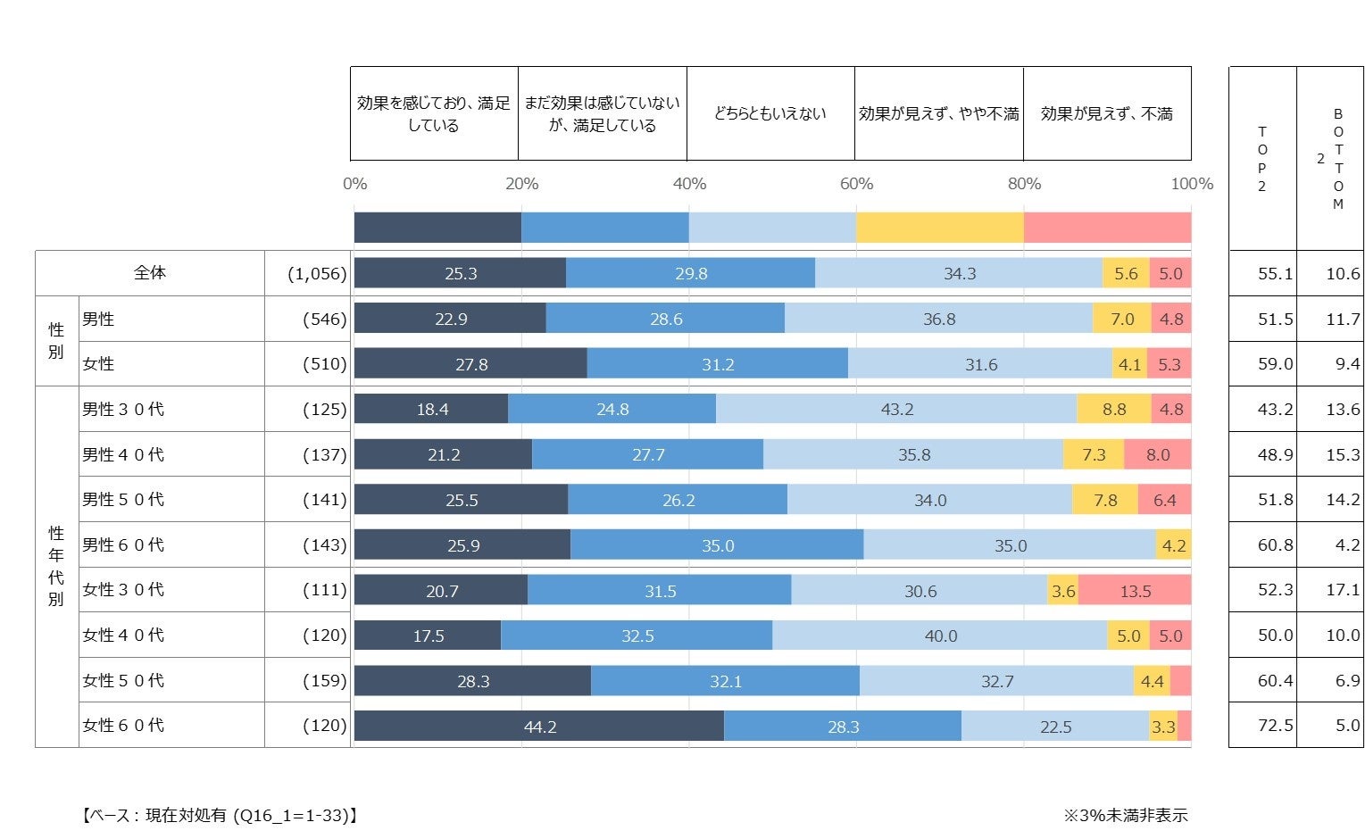一方、男性はやや年齢とともに効果、実感や満足度が上がる傾向はあるものの、女性ほどの効果、実感や満足度はない。