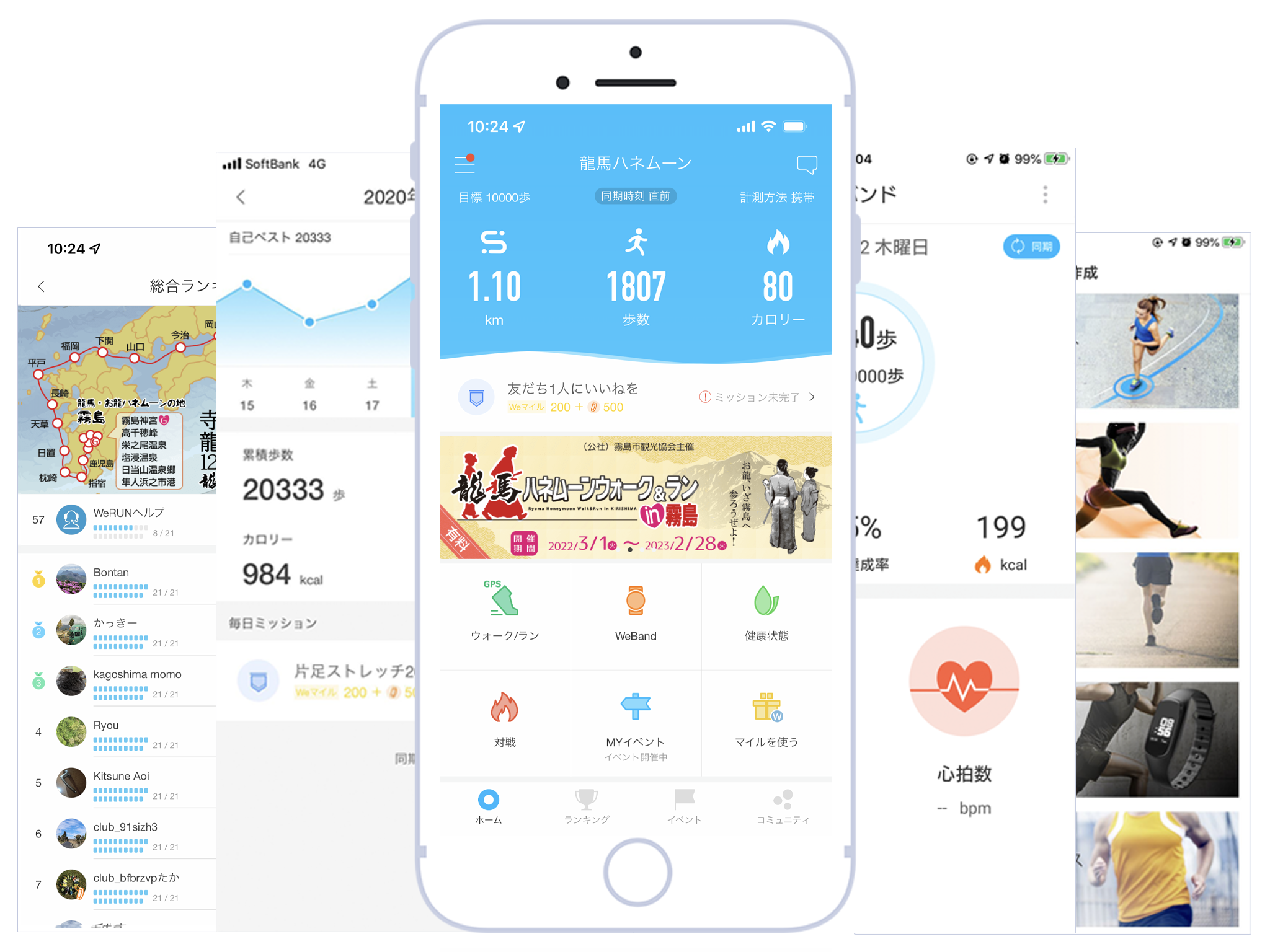 WeRUNはスマートフォンやウェアラブル端末との連携によって、歩数をはじめ睡眠、心拍数などの健康状態を計測記録し、歩数や距離データを元に多様なウォーキングイベントを簡単に開催できるアプリです。