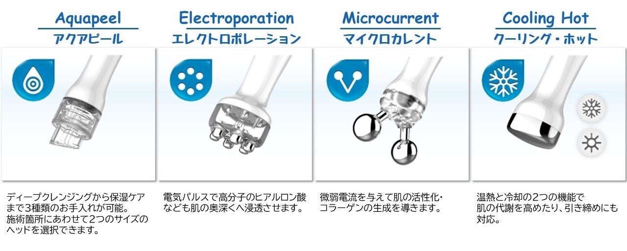 4種類のハンドピースとソリューションを備え、1台で4つのトリートメントをおこなうことができます。