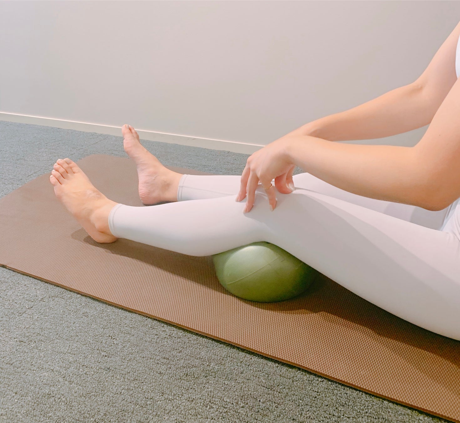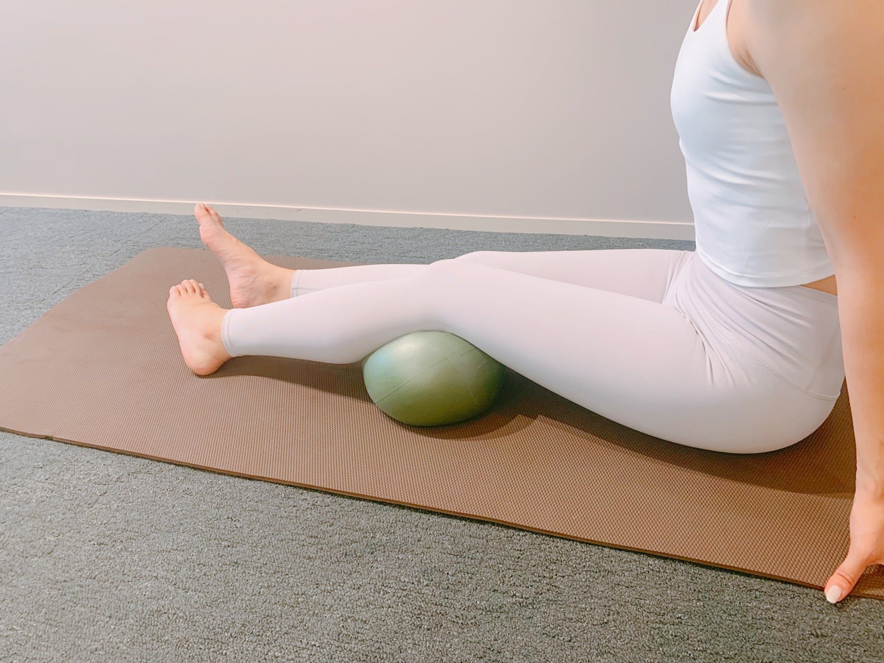 左膝の下に、フィットネスボールを入れます。脚の力はなるべく抜いておきましょう。