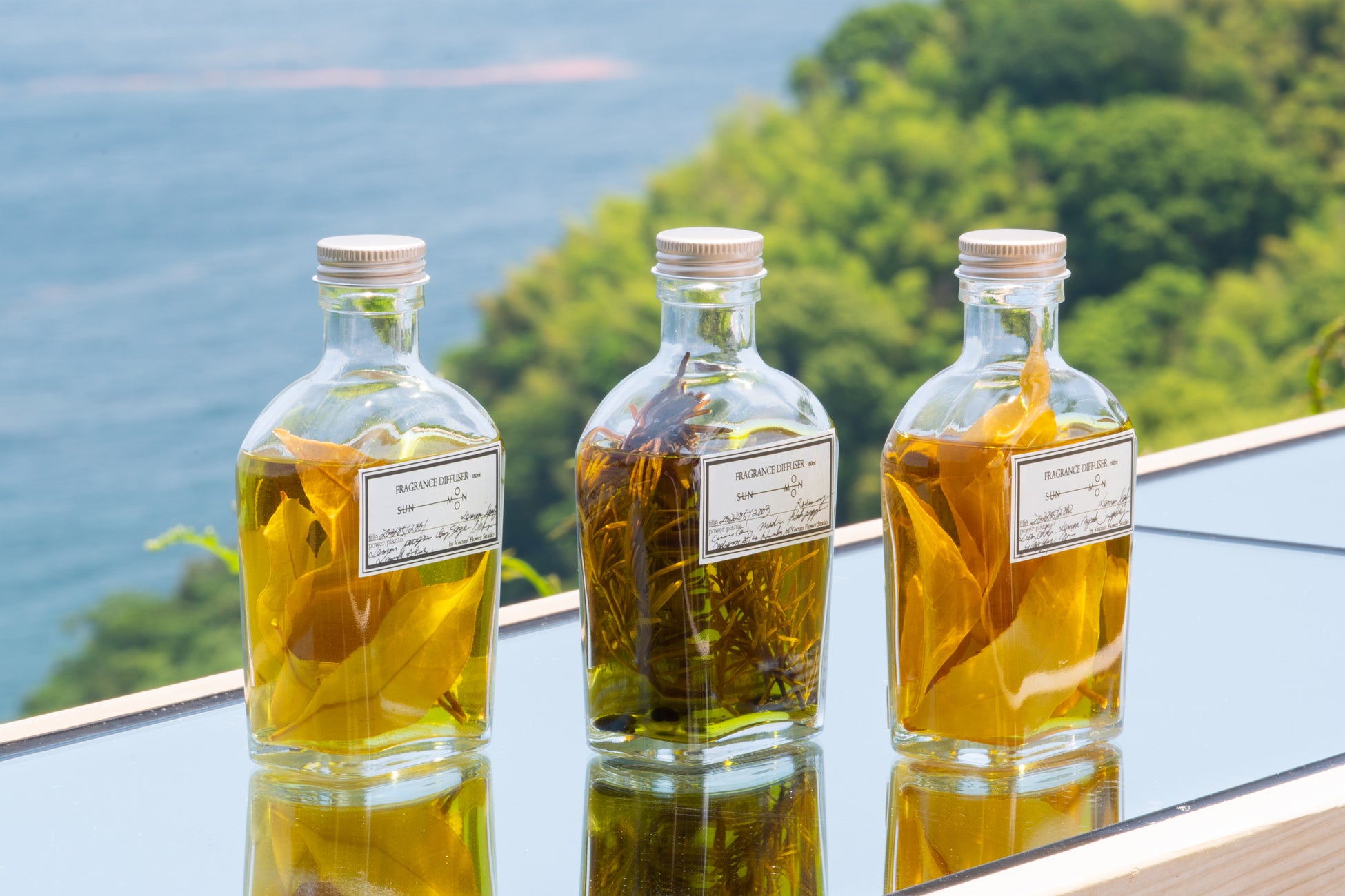フレグランスディフューザー、エタノールに沈毅(チンキ)した植物と蒸留水、香り豊かな精油をミックスしたもの。全て一点ものになります。 料 金:9,900円(税込)