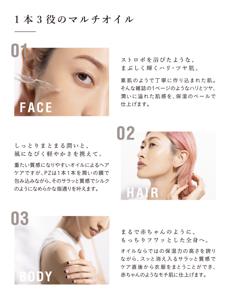 PZはヘアにも使用できるマルチオイルです。ドライヤー前の濡れた髪や乾いた髪のスタイリングオイルとしてもお使いいただけます。