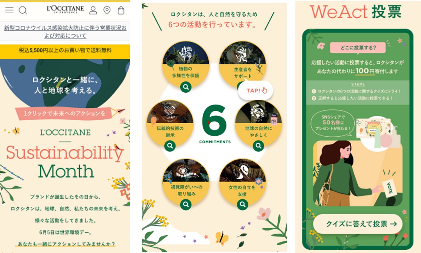 6月1日から行っている投票キャンペーン「We Act投票」は、この6つの活動の中から応援したい活動に投票いただくとロクシタンが1投票につき100円あなたに代わって寄付とするというもの。一人ひとりが小さくてもアクションを起こすことが変化を生み出すとロクシタンは考え、ロクシタンが行っているCSR 活動に誰でも気軽に参画していただける機会として企画しました。