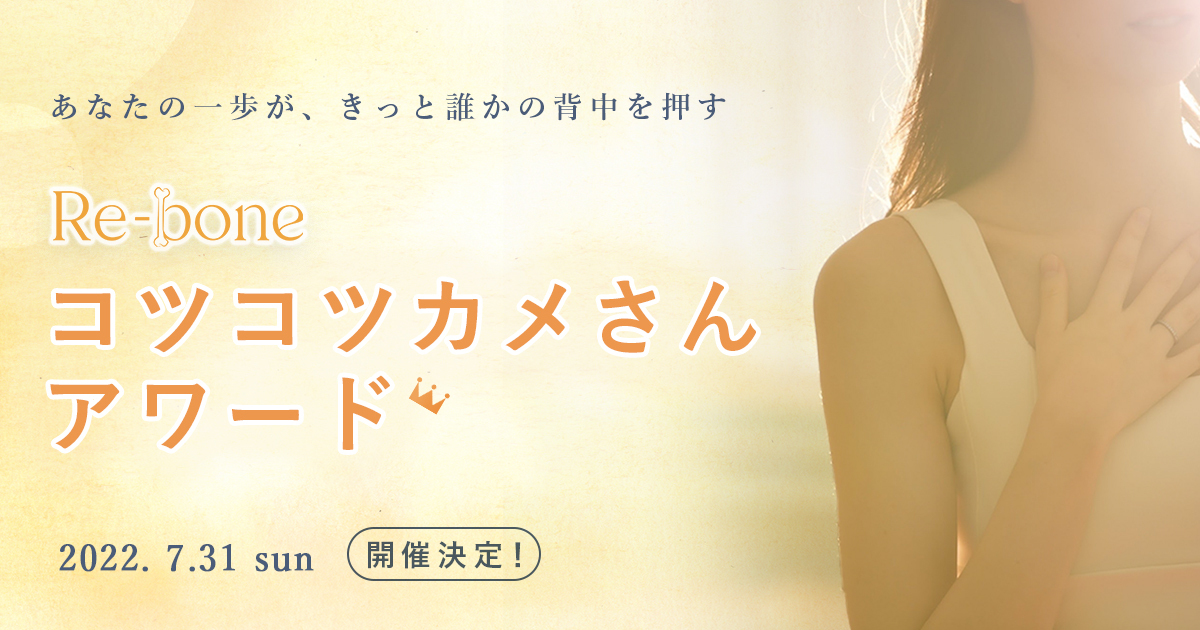 累計約5千人の受講者数をほこる、骨から整えるボディメイクスクール「Re-bone(リボーン)」を展開する株式会社Re-bone style(所在地:東京都文京区、読み:リボーンスタイル、代表:伊藤頼子、以下Re-bone)は、2023年1月に株式会社KADOKAWAよりボディメイク本の出版が決定しました。出版を記念し、Re-boneを通してココロとカラダを大きく変化させ、最も誰かの背中を押した会員さま、通称”コツコツカメさん”を称える「コツコツカメさんアワード」を2022年7月31日(日)に開催いたします。