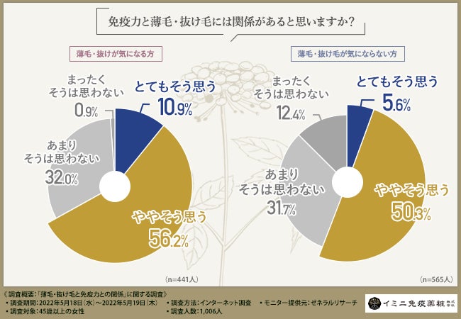 そこで今回、イミニ免疫薬粧株式会社(https://www.imini-immunity.jp/contents1.html)は、45歳以上の女性を対象に、「薄毛・抜け毛と免疫力との関係」に関する調査を実施しました。