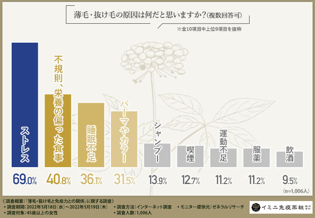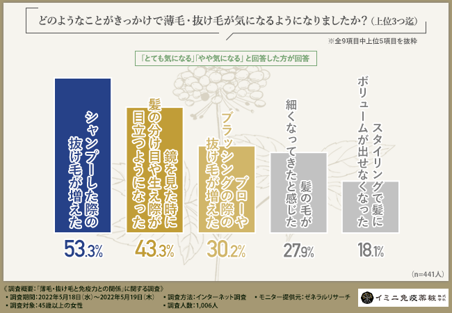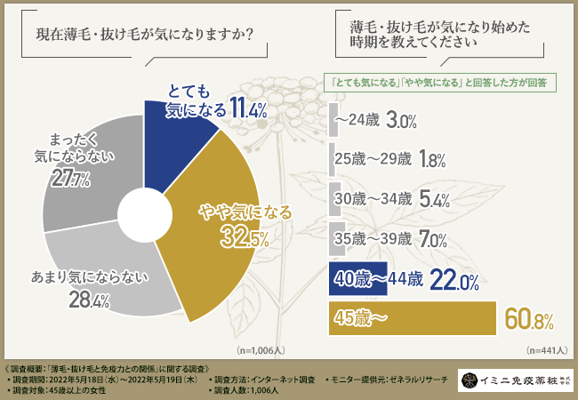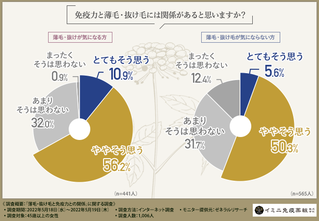 そこで今回、イミニ免疫薬粧株式会社(https://www.imini-immunity.jp/contents1.html)は、45歳以上の女性を対象に、「薄毛・抜け毛と免疫力との関係」に関する調査を実施しました。