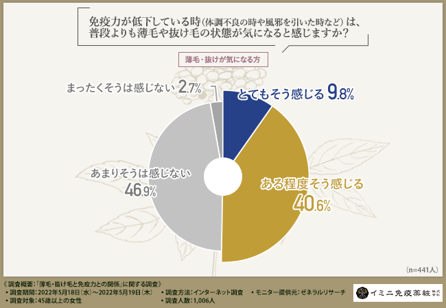 今回の調査で、薄毛・抜け毛に悩む方の約半数が、免疫力が低下している時は普段よりも状態が気になると感じていることが分かりました。
