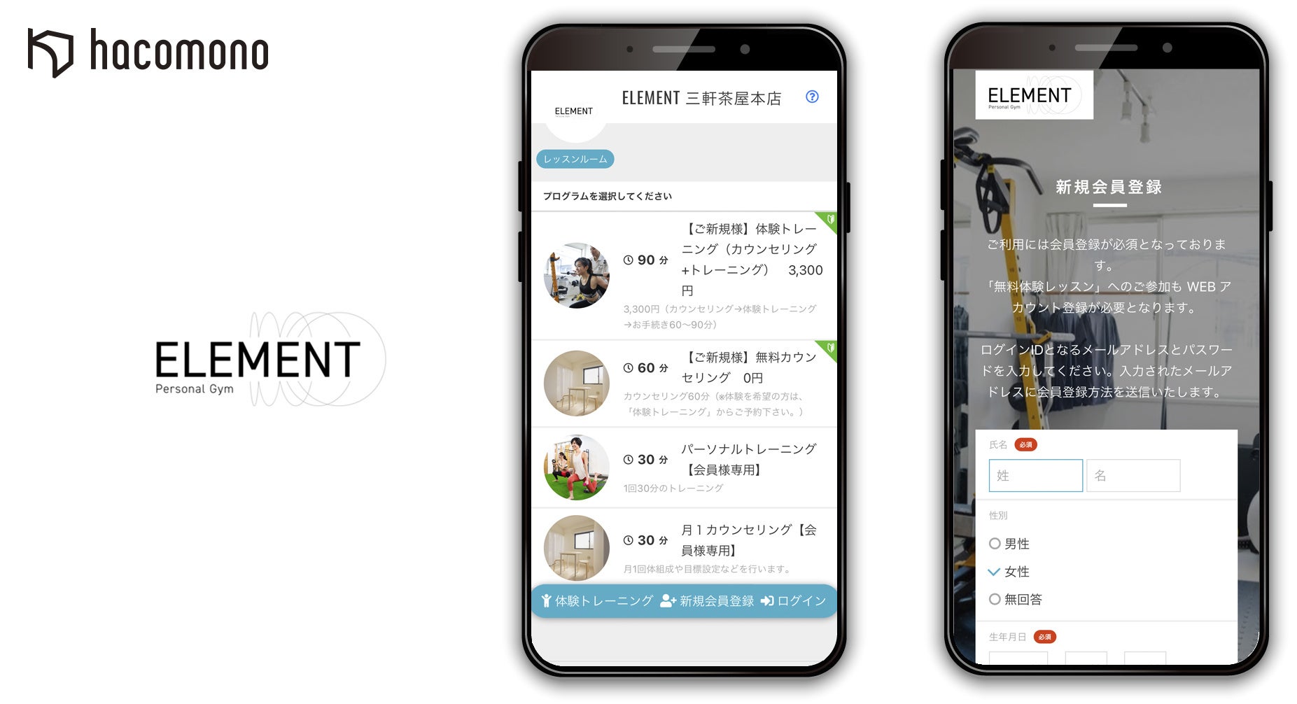 株式会社hacomono(東京都豊島区:代表取締役 蓮田 健一)が提供する店舗運営のための顧客管理・予約・決済プラットフォーム「hacomono(ハコモノ)」を、株式会社MIGRIDS((本社:山梨県南巨摩郡/代表取締役:鈴木太郎)が運営するパーソナルジム「ELEMENT」全16店舗へ導入し、店舗運営の非接触・非対面化が実現しました。