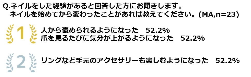 • ネイルを始めてから変わったことは、「人から褒められるようになった」「爪を見るたびに気分が上がるようになった」