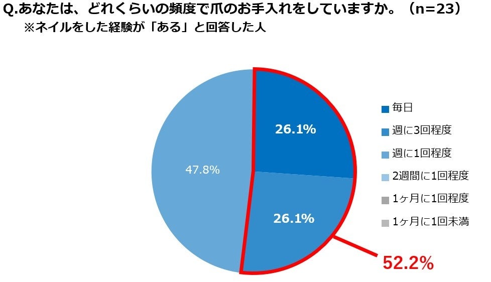 前の質問でネイルをすることに興味が「非常にある・ややある」と回答した人に「ネイルをした経験がありますか。」と質問したところ、54.8%と半数以上がネイルを経験している実態が明らかになりました。またネイルをした経験がある人の52.2%が週に1回以上の手入れを欠かさないようで、ケアの頻度の高さからも、興味だけに留まらず美容意識が細部にまでわたっていることがうかがえます。
