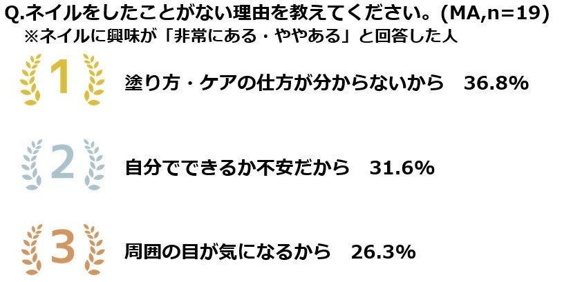 ネイルを始めたことによって、「人から褒められるようになった」「爪を見る度に気分が上がるようになった」が同数で1位という結果になりました。その他「リングなど手元のアクセサリーを楽しむようになった」等、ネイルをすることによって気分が上がったり、おしゃれをより楽しむことにも繋がっているようです。