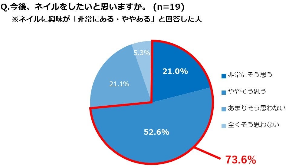 現在ネイルをしていない人に理由を聞いたところ、「塗り方・ケアの仕方が分からないから」や「自分でできるか不安だから」「周囲の目が気になるから」など様々な不安が見られ、周囲の目よりも使い方などへの不安の方が大きいようです。一方で「今後、ネイルをしたいと思いますか。」と質問したところ、73.6%の人が「非常にそう思う・ややそう思う」と回答しており、今後もネイルを取り入れる男性は増えていくのではないでしょうか。