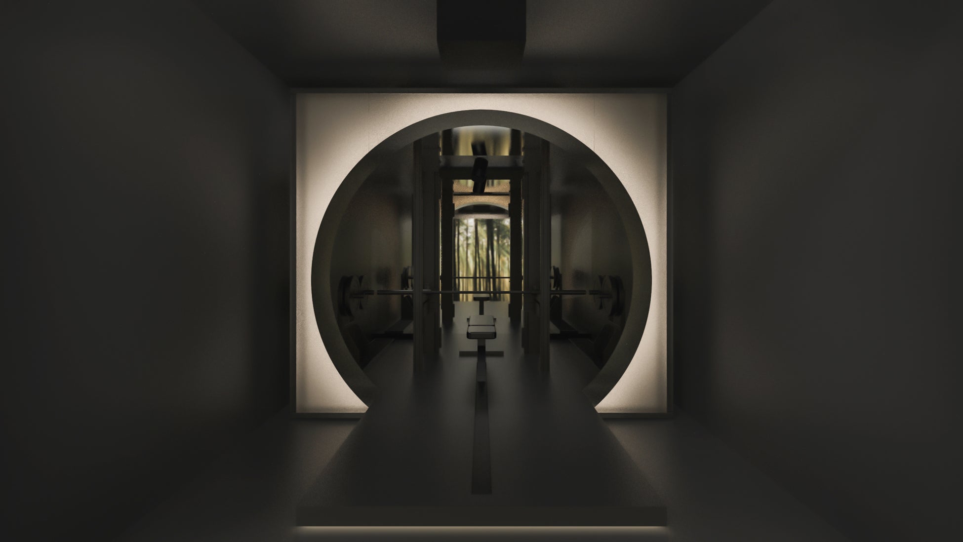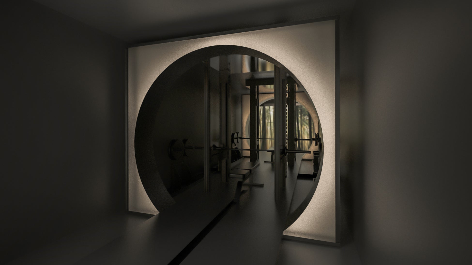 非日常空間の中で自分と向き合う特別な体験を実現するため、象徴的な演出として光のオブジェのような中間壁を採用しました。この光の円の先には壁一面の鏡が置かれ、狭い個室ジムでも広く感じられるように設計されています。壁面や床面に映し出された大画面のデジタル映像が鏡に反射し、トレーニングに連動するサウンドと相まって、デジタルとマテリアルのクリエイティブによる非日常のトレーニング体験が完成します。これまでのスポーツジムにはない、1人だけの特別な空間で自分の身体を向き合える上質な時間を体験することができます。
