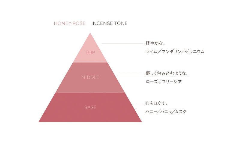 透明感のあるローズの香りにハニーを忍ばせた、一瞬で幸福感に満たされるハニーローズの香り。