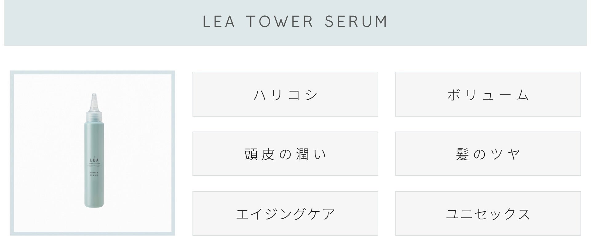お客様の繊細なお悩みをサポートしたいという想いから、頭皮の潤い&髪のハリコシを叶える、植物エキス配合の頭皮美容液(養毛料)「LEA TOWER SERUM」(レア タワーセラム)を開発いたしました。