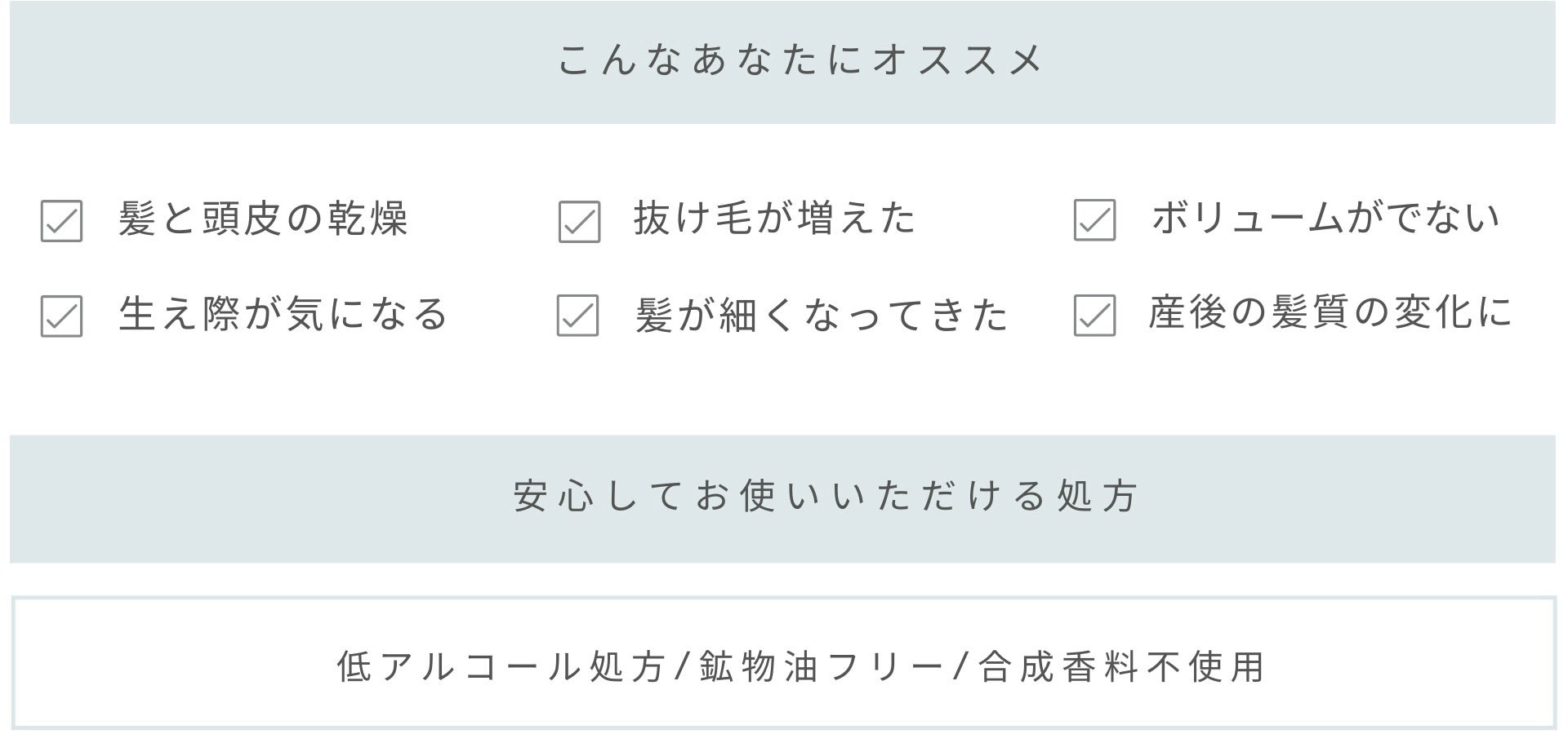 ボタニカルエッセンス(保湿成分)植物エキス配合で、潤いを与え健やかな頭皮環境に導きます。