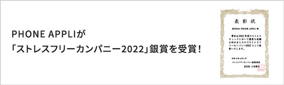 「ストレスフリーカンパニー」は、ストレスフリーカンパニー表彰委員会がストレスチェックの結果を基にストレスフリーな会社を毎年表彰する制度です。厚生労働省の定めた「職業性ストレス簡易調査票」を利用してストレスチェックを実施した会社の中から特に優れた結果の会社をストレスフリーカンパニー表彰委員会が選定し表彰しています。この度、「PHONE APPLI」は日本最大級のストレスチェックにおいて、組織全体「総合健康リスク」の指標が顕著に低かったことからストレスフリーカンパニー2022で銀賞を受賞しました。