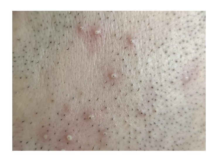 ▲毛嚢炎(もうのうえん)…ニキビのような皮膚の盛り上がりが肌表面にできる炎症