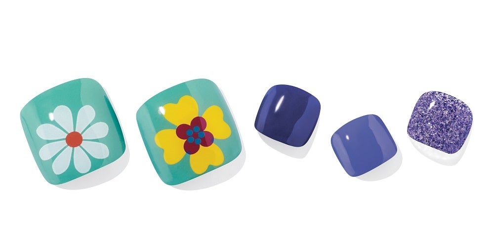 足もと一面に咲きわたるフラワーガーデンをイメージしたサマーペディ。トレンドカラーのベリーペリなどの寒色をベースに、「希望」という花言葉をもつ白いガーベラとパンジーをアシメトリーに咲かせました。日差しにきらりと映えるグリッターがアクセントに。1660円