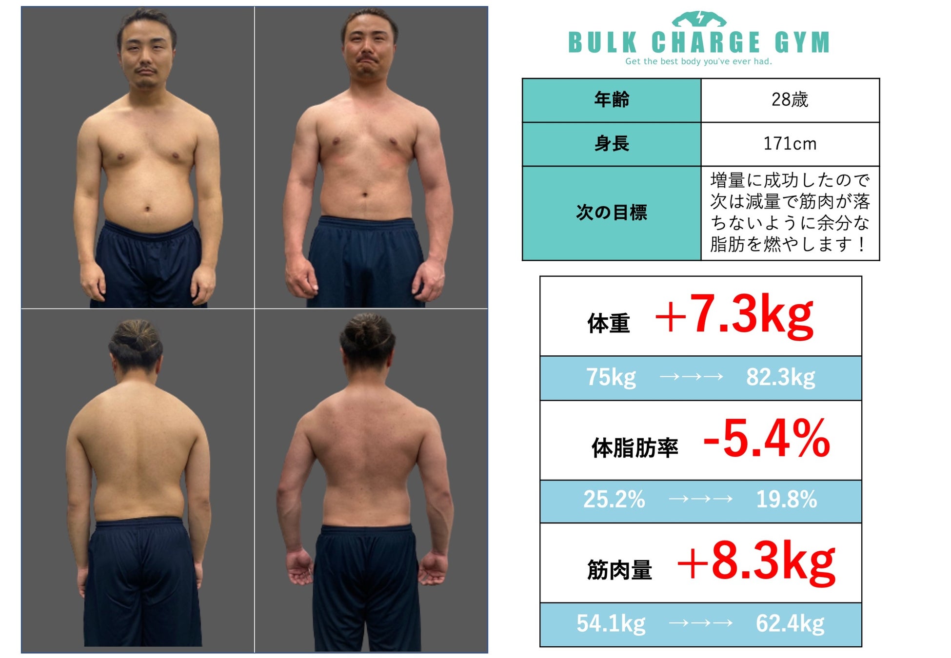 元々ある程度の脂肪はございましたが、筋肉量の付くスピードが早かったため、体脂肪率の低下も見受けられました。また、身体つきも逆三角形に近くなりお腹周りの脂肪が目立たなくなっております。