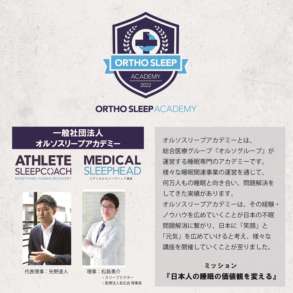 オルソスリープアカデミーとは、医療法人も所属する総合医療グループ『オルソグループ』が運営する睡眠専門のアカデミーです。様々な睡眠関連事業の運営を通じて、何万人もの睡眠と向き合い、問題解決をしてきた実績があります。オルソスリープアカデミーは、その経験・ノウハウを広めていくことが日本の不眠問題解消に繋がり、日本に「笑顔」と「元気」を広めていけると考え、様々な講座を開催していくことが至りました。