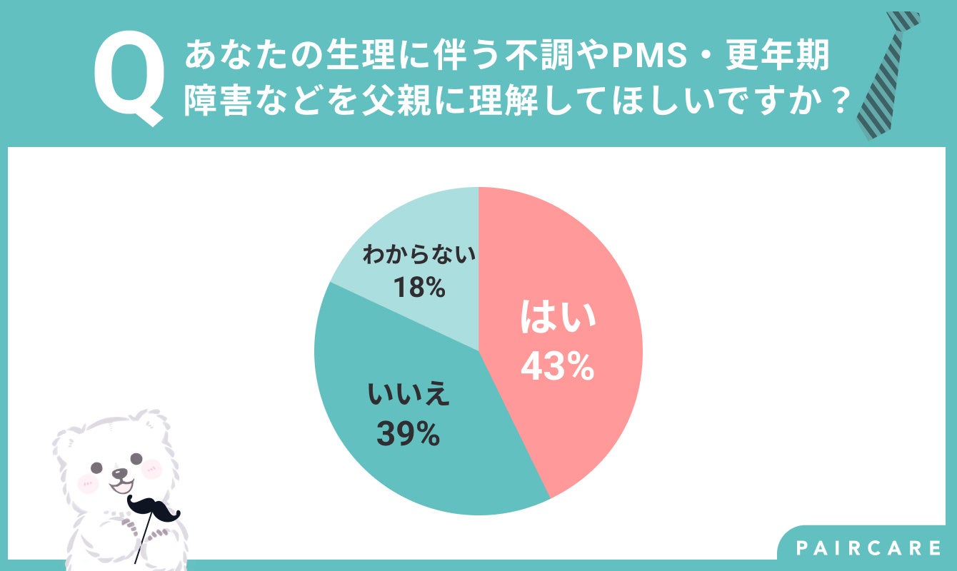 さらに、「あなたの生理に伴う不調やPMS・更年期障害などを父親に理解してほしいと思いますか?」という質問をすると、「はい」43%、「いいえ」39%となりました。