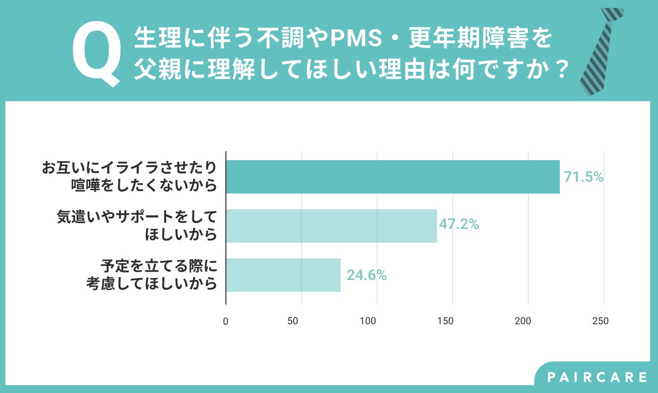 続いて、「生理に伴う不調やPMS・更年期障害などを父親に理解してほしい」と回答した人に、その理由を質問しました。最も多かったのが、「イライラさせたり、喧嘩をしたくないから」71.4%、次いで「気遣いやサポートをしてほしいから」47.2%、「予定を立てる際に考慮してほしいから」24.6%でした。