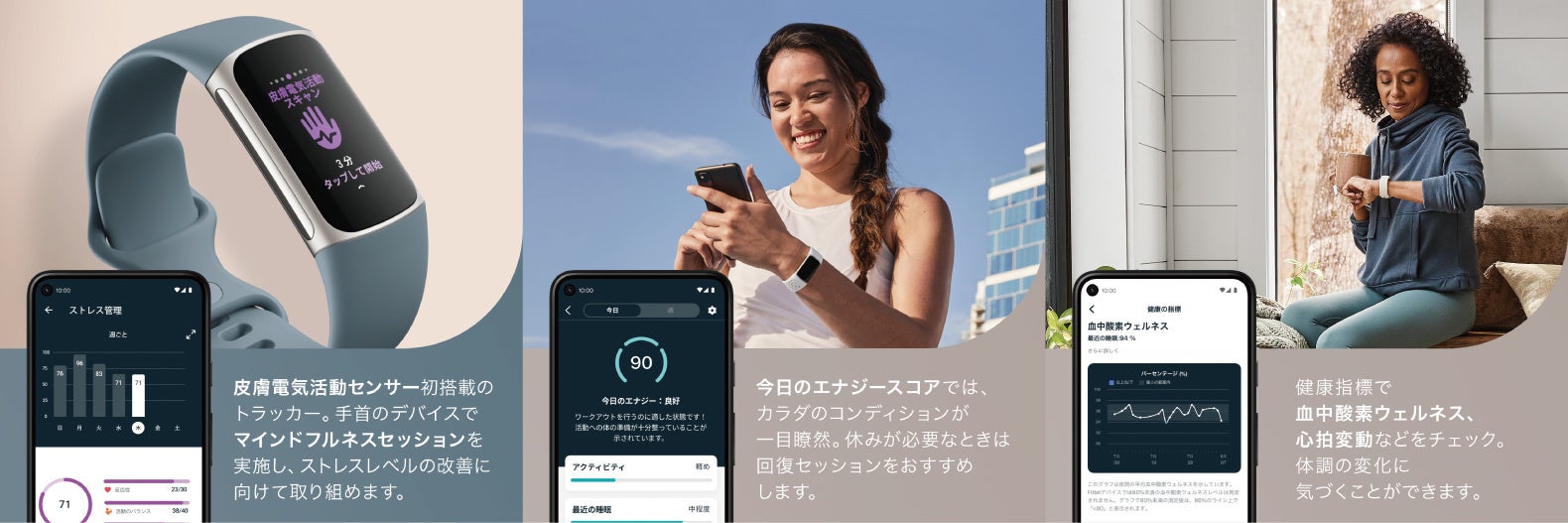 スマートウォッチ、トラッカーから各種アクセサリまで、Fitbitは歩数や心拍数、睡眠時間、ストレスを含む主要データをトラッキングして個人の健康状態全般の改善を支援できるように設計されている幅広い製品を提供します。他にも、Fitbitのアプリおよびスマートウォッチが提供する血中酸素ウエルネスや皮膚温度、呼吸数等、健康状態を手軽に把握するための指標となる各種データによって、健康状態の傾向や変化を知ることができます。これらのデータを活用することで、ストレスの管理や健康増進、ダイエットの目標等を達成することができます。