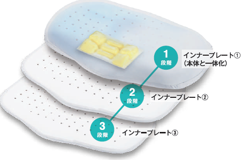 人それぞれの、骨格や筋肉に合わせ調整できる3段階のインナープレートで、好みの高さに調整でき最適な寝姿勢と寝返りのしやすさを実現します。