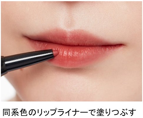 リップの密着度を高める下地として同系色のリップライナーを使うと、リップメイクが長持ちします。全体をリップライナーで塗りつぶしたあと、リップを重ねます。唇が乾燥しやすい方は、リップメイクの前にリップクリームで唇の状態を整え、表面を軽くティッシュでおさえましょう。