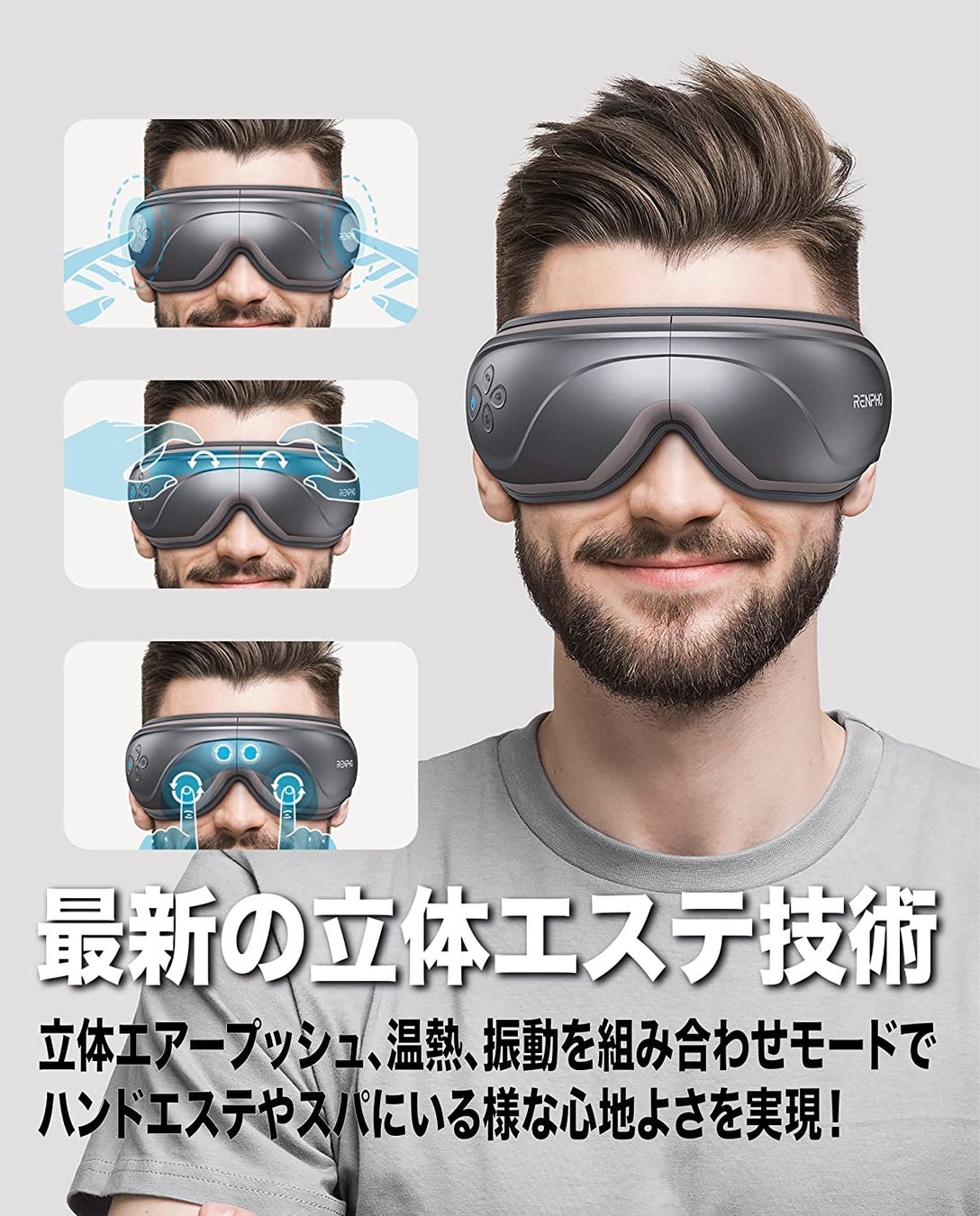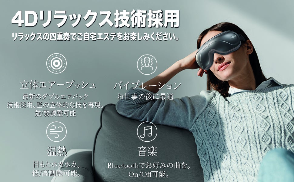 最新技術を搭載した高機能『目元エステ・アイウォーマー』が、おしゃれな2色で登場(グレー、パープル)。4Dリラックス技術採用により、1) 立体エアープッシュ、2) 温熱、3) バイブレーション、4) 音楽の効果で目元をご自宅でリフレッシュ。押す感覚のみの製品が多いですが、 当新製品はダブルエアバック技術により、プロのハンドエステのような立体的感覚を実現しました。 人間工学による3D設計で鼻の周りに隙間ができにくく、優しくフィットする構造になっています。Bluetooth機能を搭載しており、スマホやタブレットなどと接続して、好きな音楽を聴きながらリラックスできます。