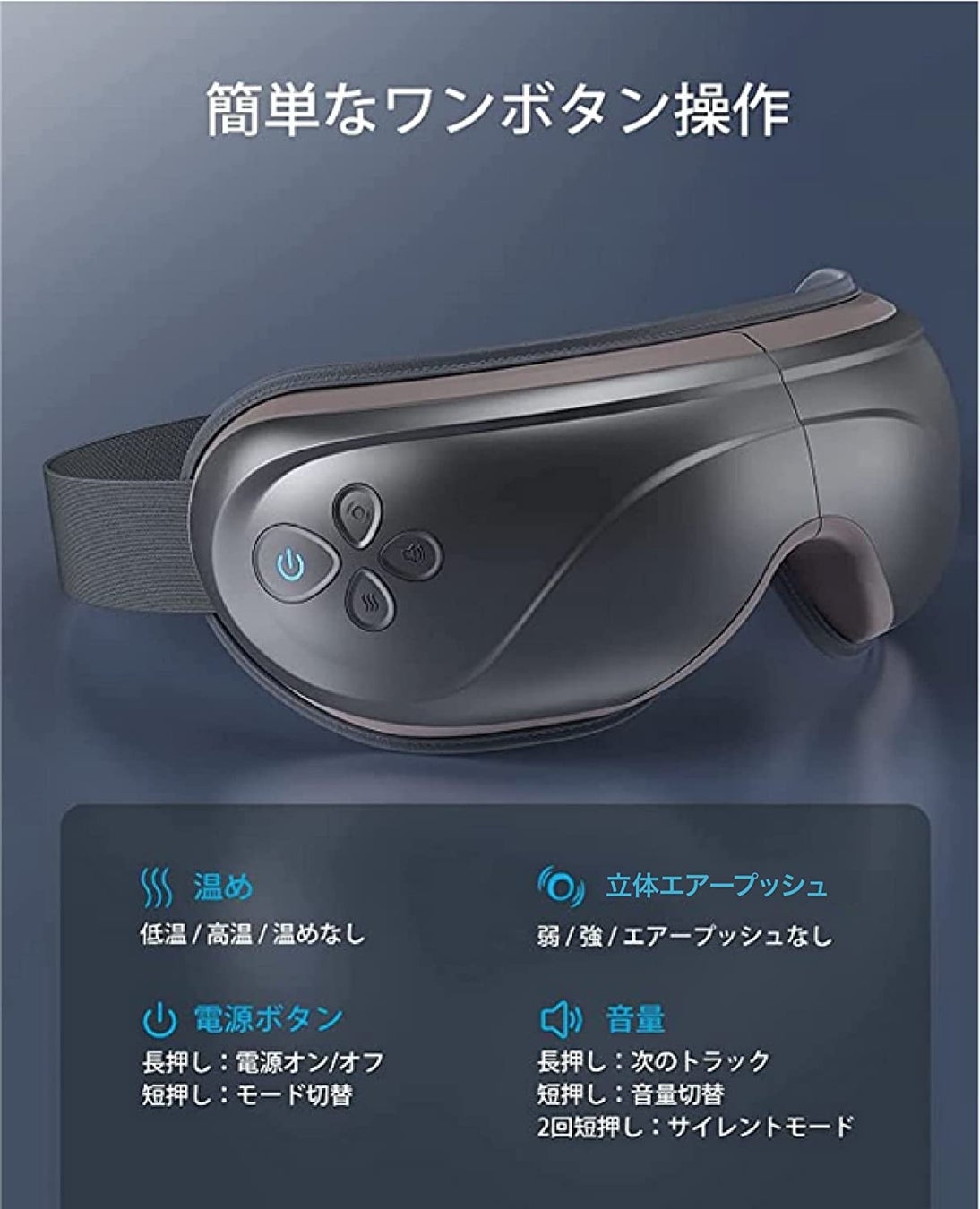 【ダブルエアバック技術】ダブルエアバック構造で、当製品のエアープッシュは、より複雑で立体的なハンドエステの感覚を実現し、大切な目元をケアしてリラクゼーションしていただけます。まるでプロのエステを受けているような感動体感をお楽しみください。強弱2段階調整も可能です。3D設計でフィット感も優れています。頭の大きさに合わせることができ、ヘッドバンドで一番フィットする所に調節して、目元ケアをお楽しみいただけます。