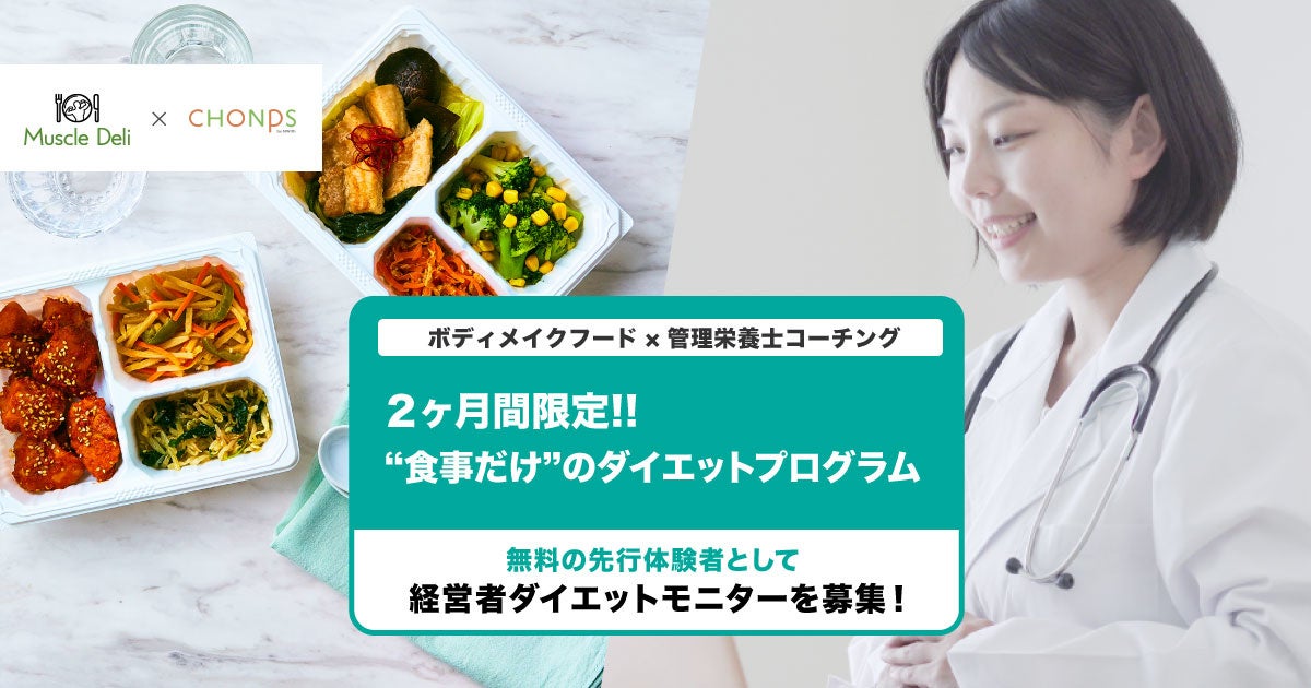 今回、その効果を実証するため、マッスルデリが提供する「栄養バランスのとれた食事」の定期配送と、Nwithが提供するCHONPSが提供する「栄養士のコーチング」による「食事だけのダイエットプログラム」の先行モニター募集を開始いたします。