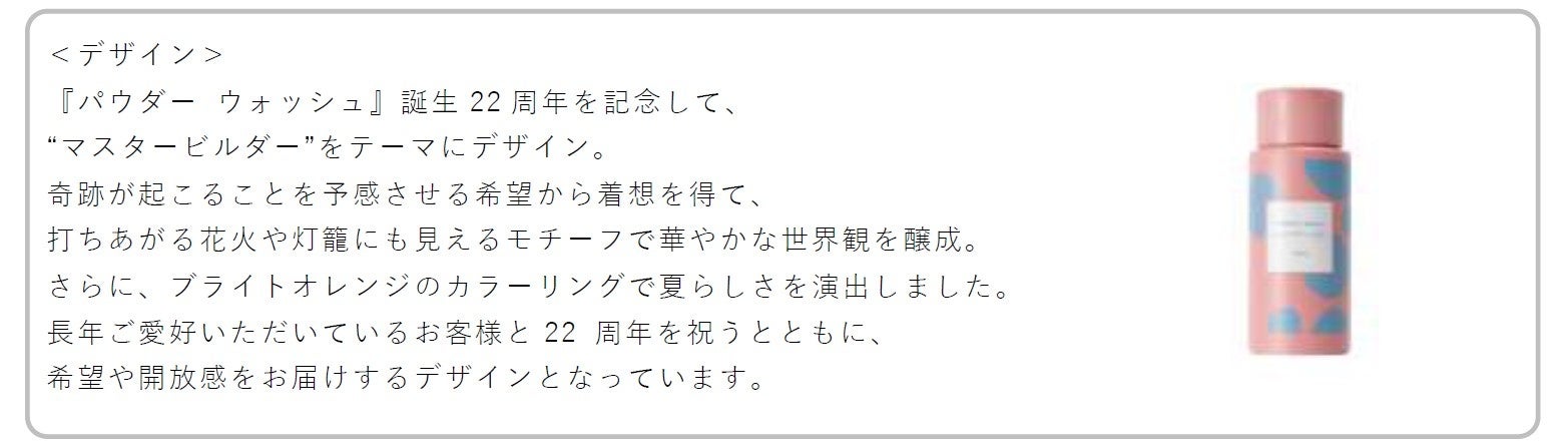 オルビスは、創業以来「肌が本来持つ力を信じて、引き出すこと」を信念とするビューティーブランドです。2018年以降「ここちを美しく。」をブランドメッセージに掲げ、“ここちよさ”を単なる感覚的なものと捉えず、科学的に研究しております。2000年の発売時から大変ご好評いただいている『パウダー ウォッシュ』は、2022年夏に発売22周年※2を迎えます。今回、ご愛用いただいているお客様への感謝を込めて、『パウダー ウォッシュ プラス』限定デザインボトルを数量限定発売します。限定デザインのテーマは“マスタービルダー※3”。長年ご愛好いただいているお客様と22 周年を祝うとともに、希望や開放感をお届けするデザインとなっています。