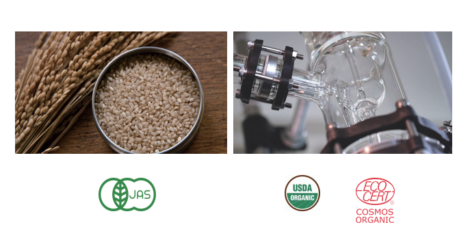 原材料となるオーガニック米はJAS有機認定を取得、また「オーガニックライス・エタノール」は高い認証基準を持つUSDAオーガニック認証およびエコサートCOSMOS認証の2つの国際オーガニック認証を取得しています。化粧品・日用品・衛生用品の原料として、エタノールは幅広く使われていますが、オーガニック認証を取得したエタノールは世界でも少ないのが現状です。サステナビリティやトレーサビリティが求められる中で、「オーガニックライス・エタノール」は原料から製造まで100%トレーサブルな国産のオーガニックエタノールとして安心してご活用いただけます。