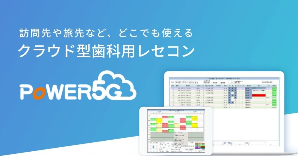 クラウド型歯科用レセコン「POWER5G(パワーファイブジー)」は、時間と場所にとらわれることなく、ご自宅や訪問先など、どこでも入力できるクラウド型歯科用レセコンです。レセプト業務の効率化とコスト削減を1つのシステムで可能にし、リモートワークにも気軽に導入でき、作業効率の向上と働き方改革を実現します。