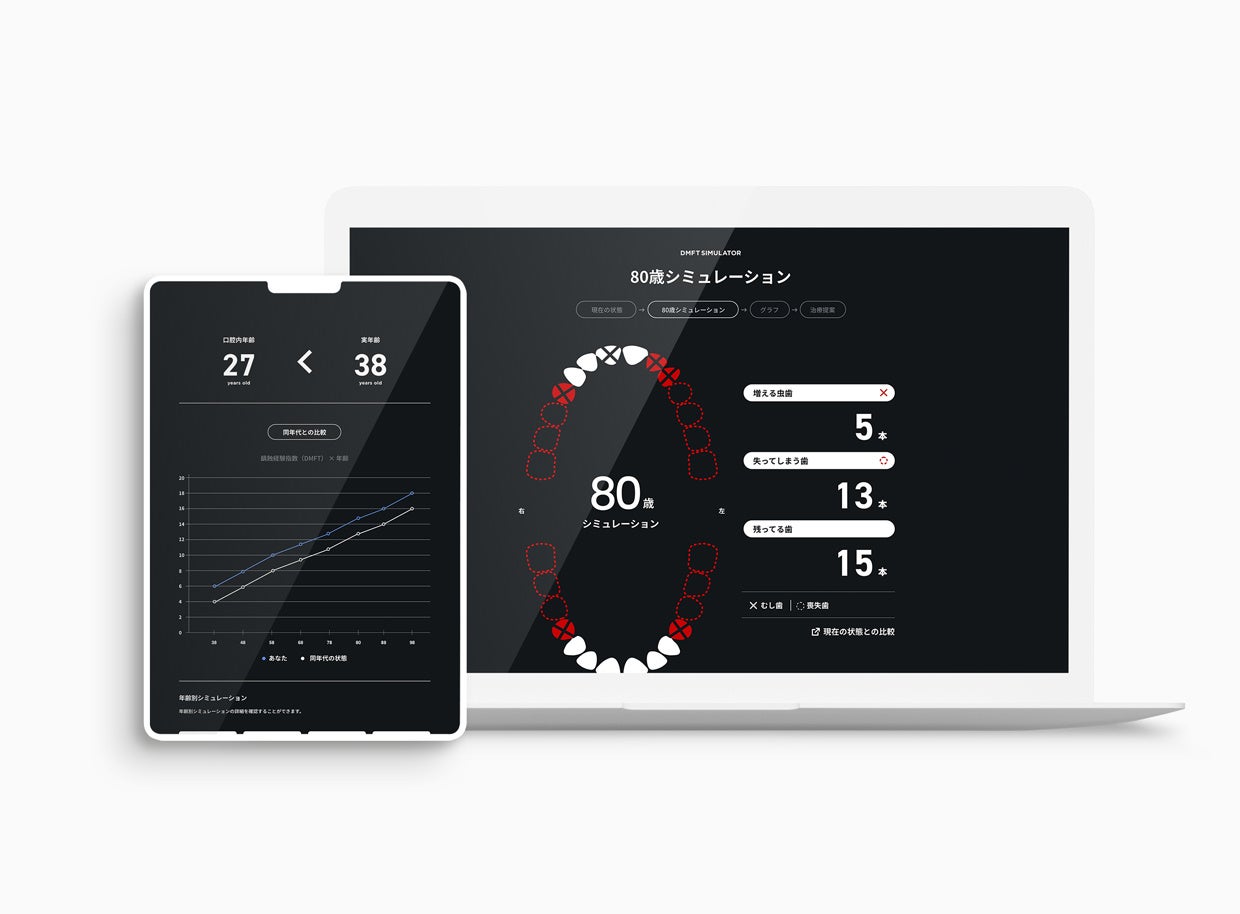 「DMFT SIMULATOR」は、厚労省が出している歯科疾患実態調査と協力クリニックによる実際の患者データを元に解析を行い、患者さんの現状の口腔内状況とその後95歳までどのように口腔内が変化していくかシミュレーションを行い、患者さんに説明できるコミュニケーションツールです。