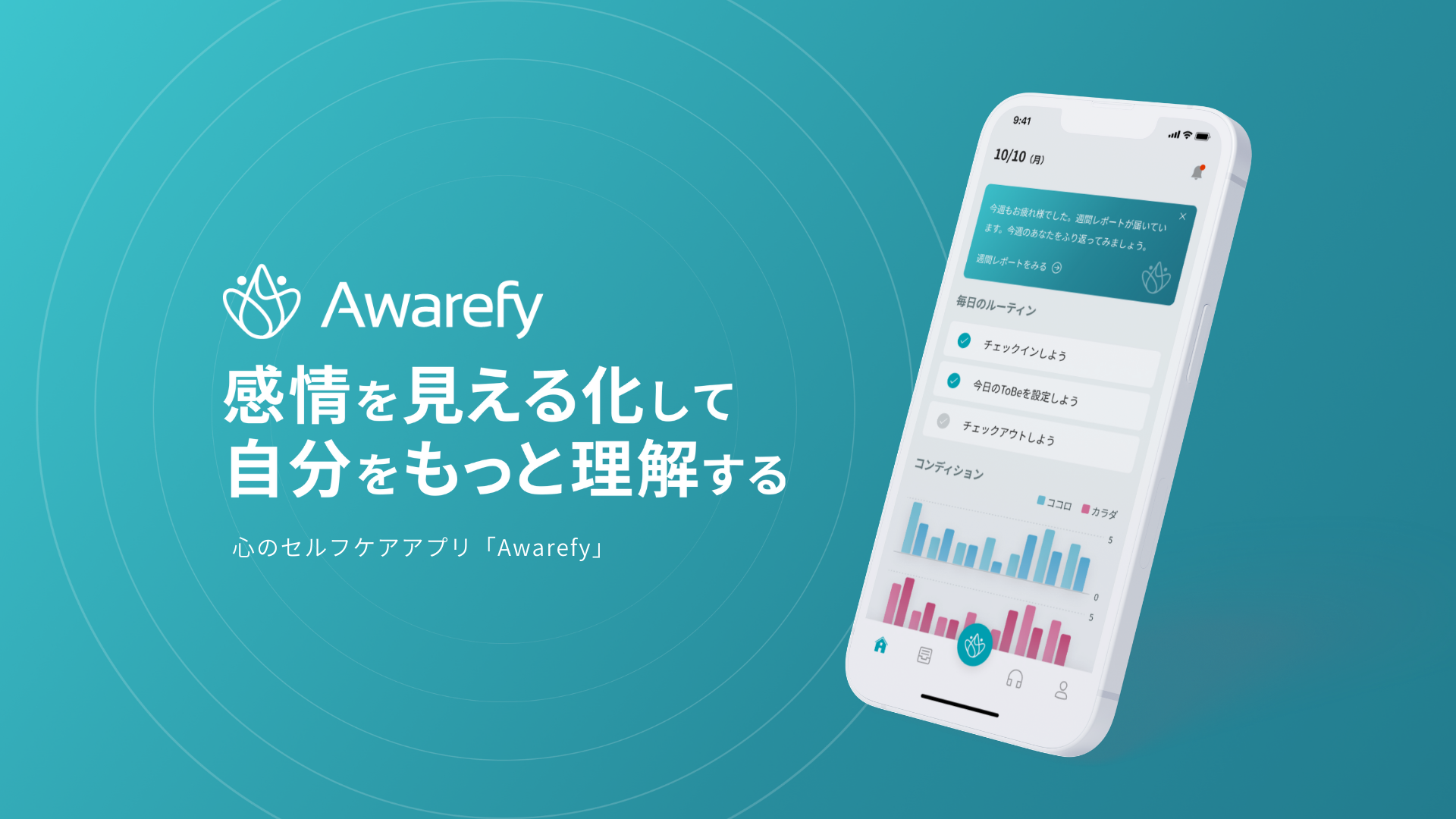 Awarefy は、この認知行動療法をベースに開発を行っている「デジタル認知行動療法アプリ」です。アプリで手軽に日々の体調や感じたことを記録していくことで、自分の考えや行動を客観的に理解し、より良く生きるための考え方と行動習慣を身につけることをサポートします。