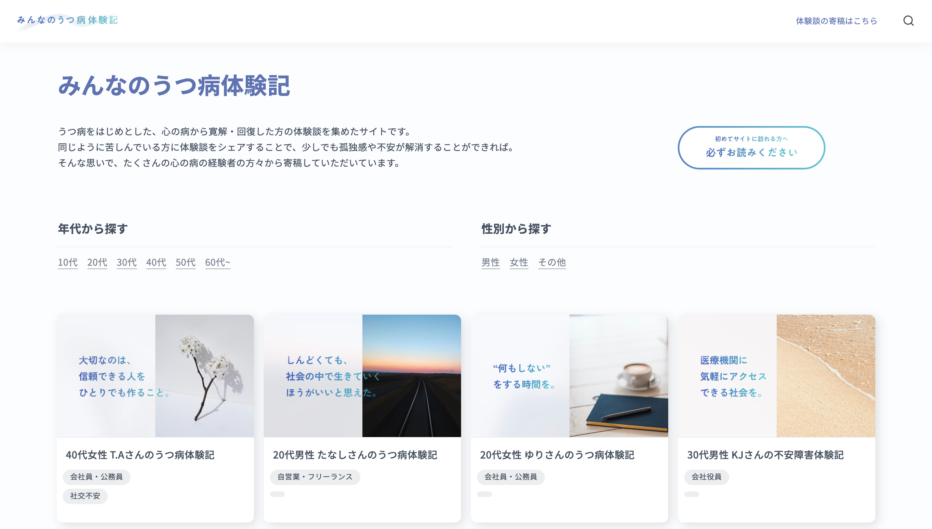 現在、10本以上の体験談が集められています。今後、読者にとってさらに役に立つサイトとなるために、うつ病をはじめ、不安障害やパニック障害、双極性障害など、さまざまな体験談を掲載していく予定です。