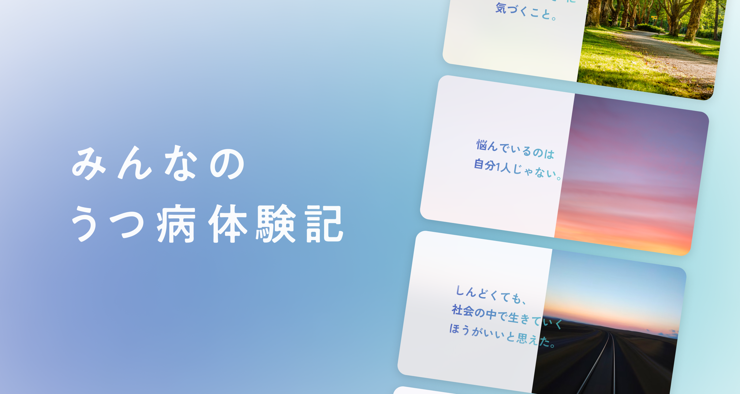 これらの現状を受けて、過去に心の病を経験した方の体験談を、現在進行形で苦しんでいる方にシェアし、それを通して孤独感や不安を解消することを目的として、サービスをリリース致しました。