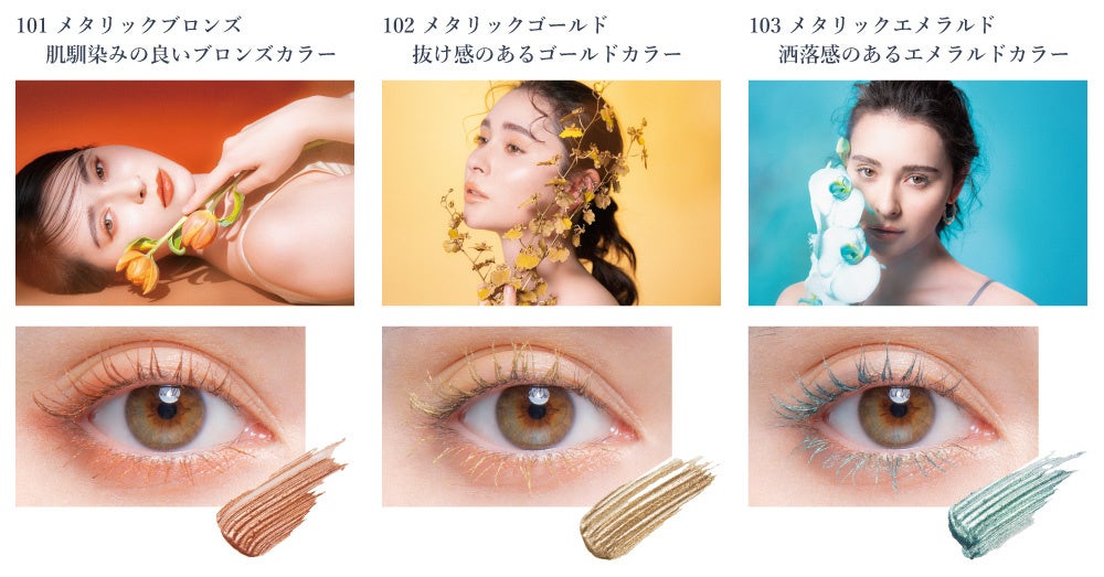 美容液うまれのカラーマスカラは、光質感のメタリックパールで、まつ毛にも瞳にもまばゆい艶めきを与えます。